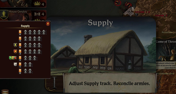 d. 把史塔克家族的补给标记放在补给1处,兰尼斯特家族和葛雷乔伊家族、拜拉席恩家族、提利尔家族的补给标记放在补给2处。