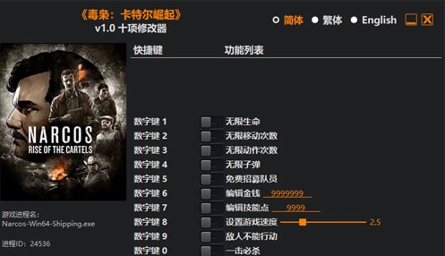 很多平时只看毒枭美剧的粉丝来玩这款回合制策略游戏,会觉得游戏难度比较大,所以下面带来推荐一款修改器,玩家们可以修改自己的金钱和技能点,行动也不受限制,帮助更轻松地通关游戏。