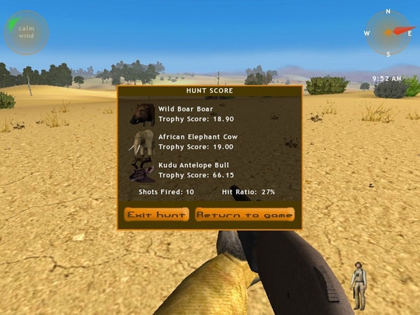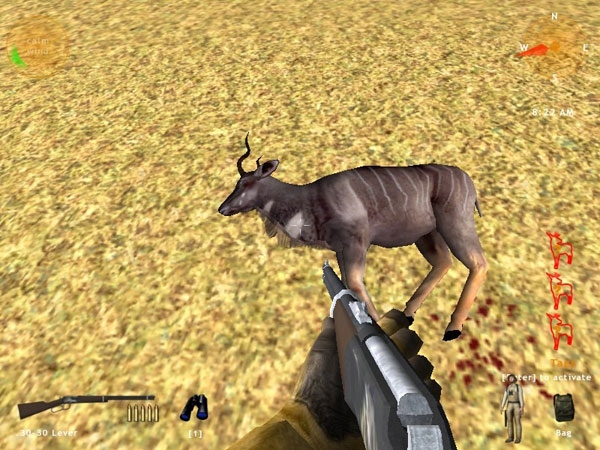 其次,最好一枪命中要害,这个有大概20还是40的加分来着。有4个要害部位(也有加分):头部,脊椎(脖子中间),心脏前肢根部靠左,这三个部位中弹对于一般动物立马倒下,肺部也是要害部位,但中弹后动物会继续逃命一段距离,有些动物在这期间仍然有攻击力。不同动物跑的不一样远。对于大象这种动物,即使用杀伤力很大的武器,要害中弹也不会使它立马倒下。