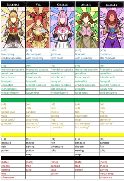 快速浏览每个女孩的偏好状态,至少在礼物方面。