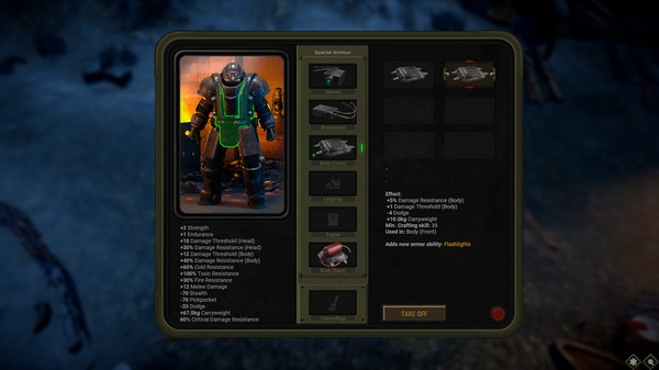 力量+3,负重+20公斤,闪避-8,智力-1,毒素抗性-10。