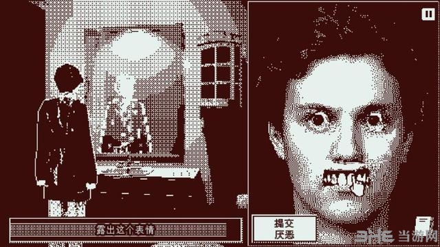 游戏界面基于开发者的极简理念而拥有着简洁无比的UI,屏幕竖着从中间划分为两半,右边是一种尚算帅气的大脸,左边则是传统的点击探索页面。这个界面和玩法密切相关,游戏的主要玩法就是通过在左边界面控制角色四处移动并且和可触发的线索进行互动,右边的大脸则是在跟NPC对话的时候作出相应的表情,表情功能取代了传统对话中的分支选项。