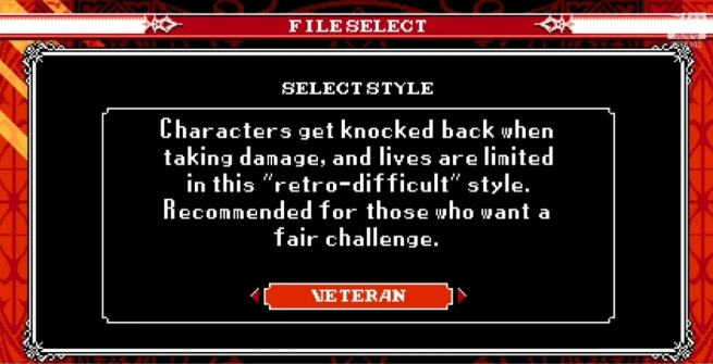选关之后会出现上述对话框, VETERAN就是“老兵、熟练工“的意思,代表高玩难度,受到害有击退效果(神烦),每小关有命数的限制。 CASUAL就是“休闲”的意思,适合新手或休闲玩家,没有击退效果,可以无限从存档点(蜡烛)处复活。