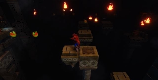 如图位置,有几个悬空苹果的地方,过去是有个隐形桥的,收集钻石的话需要过去打烂大堆箱子。