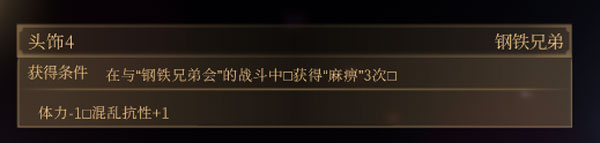 获得条件:在与“钢铁兄弟”会的战斗中获得“麻痹”3次