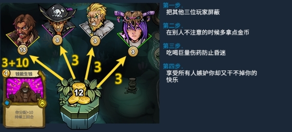 核心要点就是严格注意自己和其它玩家的相互排序,让互利性的卡牌尽量使用到相对威胁较小的玩家身上,你则可以持续的从这个过程中获利。