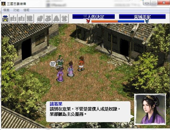 故意的情节以姜维为主角,将历史随着游戏的进程而重现,故意以正常历史发展为主,偶尔加入一些虚假剧情。在进行每关游戏之前都可以选择简单和困难。红色代表杨兰,蓝线代表着诸葛果。