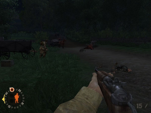 前方的一辆马车被击倒,随后指挥队伍以倒下的马车为掩护压制第二辆马车,自己摸过右翼的空地解决第一组。随后观察会发现,道路的尽头是一架MG42,不要妄想强攻(真实战场上有这种无限弹药没有枪口过热问题的秒杀武器就好了)。带队拐进道路左侧的草地,正前方会有一组敌人,右侧也有。这时压制好正面之敌,自己从中间安全的位置顺着该敌左翼摸到安全地带,站起杀敌,没什么困难。随后就是如法炮制的对付最后一组敌人,他们的右侧会是空缺。然后对机枪手来个“暗杀”。接管机枪,对沿着道路进犯之敌展开屠杀。