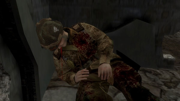 再往右面饶到前面转弯 这里要小心楼上的敌人 (不用理会他们) 直接往前面跑再转弯饶过去 这里有堆箱子藏在后面 干掉之后来到边上的教堂里 里面躺这几个不知道是死是活的德军 看着不爽的可以对他们开几枪 - - 然后再出去迎面回冲来敌人 哈 这里尽情的用机枪扫射吧 (我的手柄好震- -) 这里会陆续的出现敌人 具体怎么打我就不说了 总体就是用机枪华丽的扫射 全都干掉之后关卡二END~