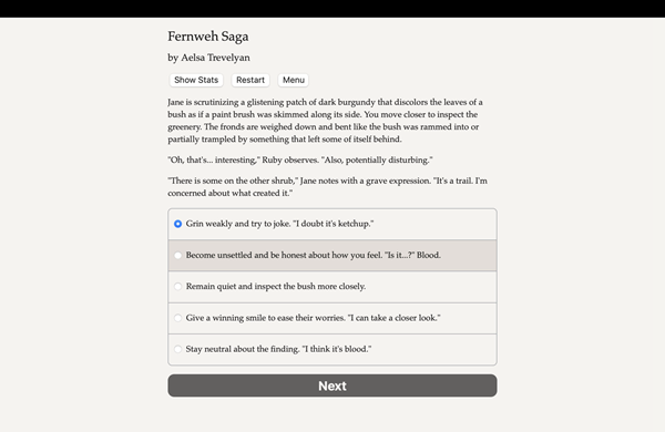 芬威传奇:第一册(The Fernweh Saga: Book One)是由Hosted Games制作发行的一款互动小说类游戏,游戏由惊悚悬疑小说改编而来。在游戏中由全文本打造,玩家将在故事中面对多种选择,丰富的故事线,不同的游戏结局,精彩的剧情等你来体验。