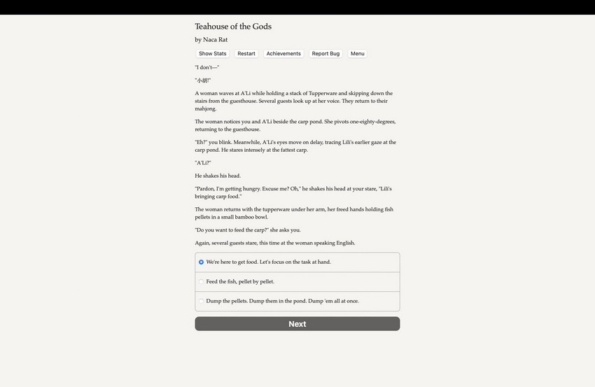 众神的茶馆是纳卡·拉特的一部25万字的互动小说。它完全是基于文本的,没有图形或声音效果,并由你的想象力的巨大而不可阻挡的力量推动。