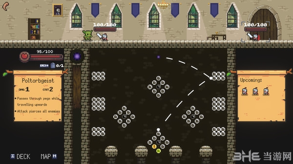 Peglin将幻幻球(Peggle)和杀戮尖塔(Slay the Spire)的玩法机制相结合。敌人很难对付,如果你被击败了这局游戏就结束了。但游戏过程中,你会获得各式强力的弹珠和神奇的遗物。每种弹珠都有不同的能力。而遗物则会对你或敌人造成不同的效果,有些甚至会影响游戏的物理特性。利用好它们来打败敌人吧。