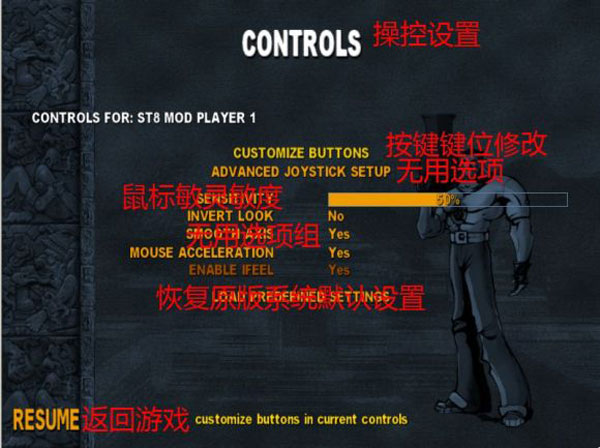 根据图中内容所示,最上面是修改按键的,需要的玩家也可以自己修改,灵敏度在第三行,边上有显示百分比,还比较好认,其余选项大致都不怎么需要修改。如果修改按键出错了,也可以通过恢复默认设置的功能重置。